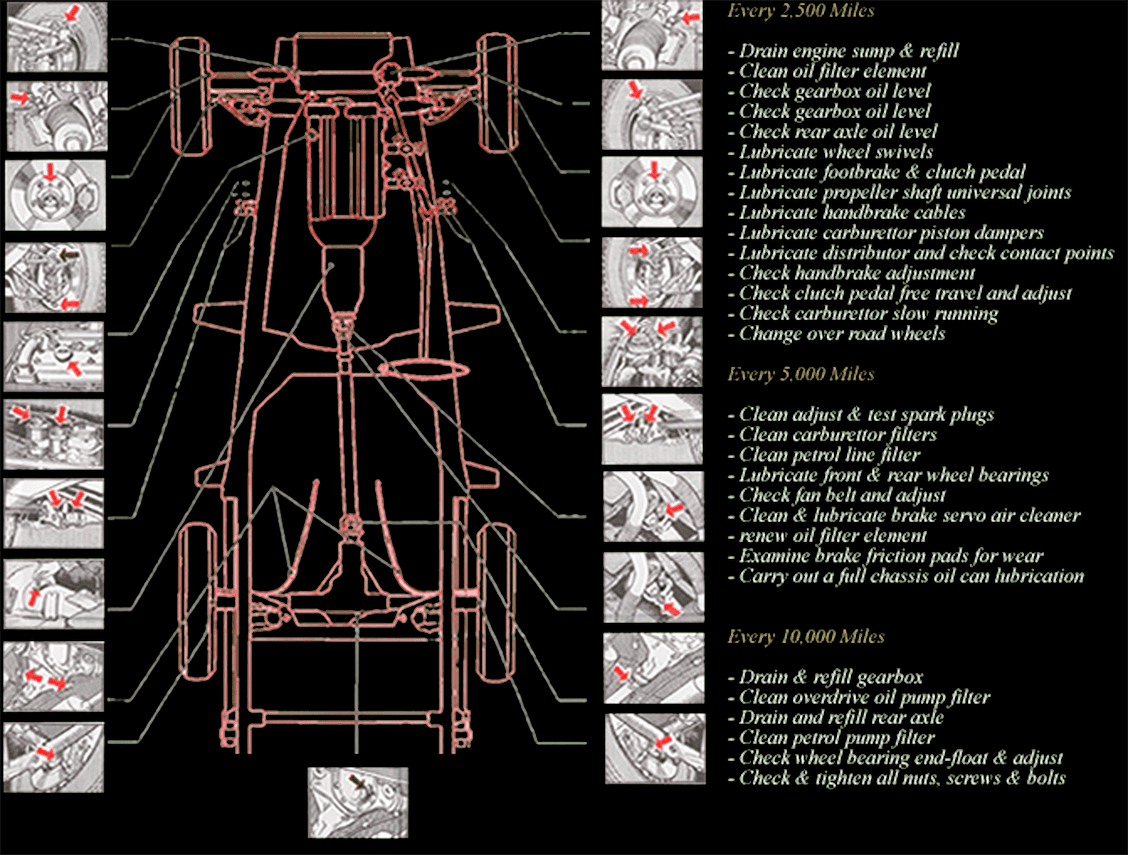 Classic and high-performance sports cars require far more regular and extensive maintenance than modern, mainstream vehicles. You will see from our diagram here that there are maintenance routines that should ideally be done every 2,500, 5,000 and 10,000 miles.